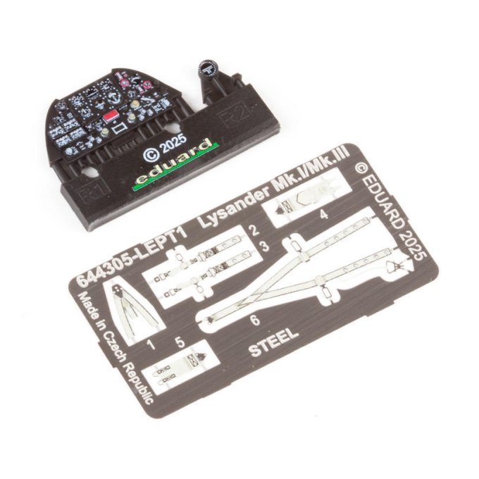 LööK set Brassin pre-painted dashboard and STEEL seat belts for Lysander Mk.I/III in 1/48 scale. Easy to assemble, replaces plastic parts.