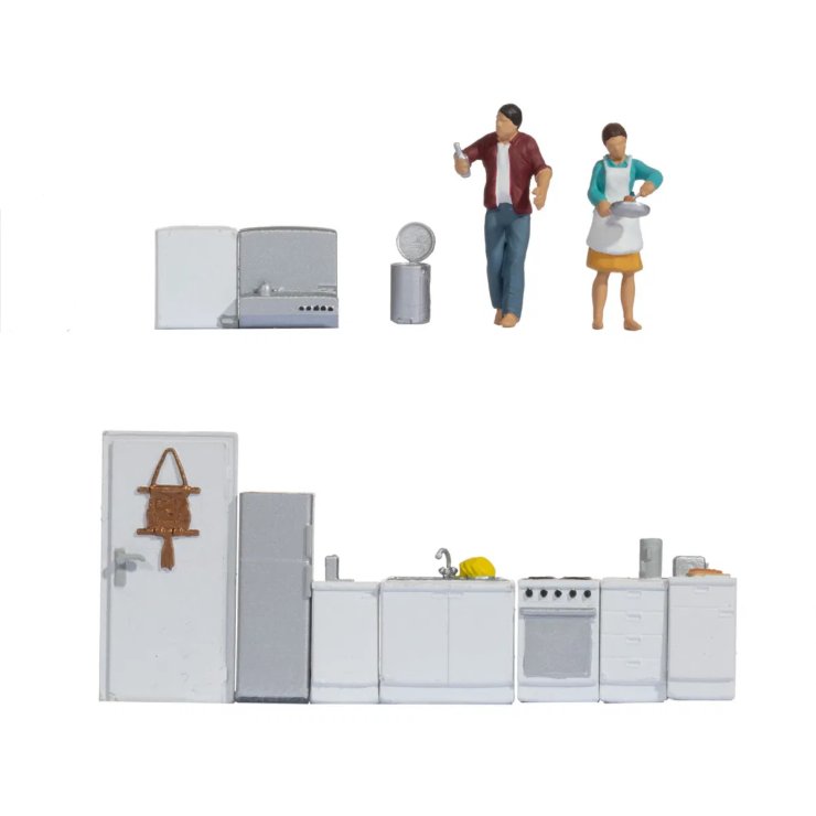 The NOCH "Kitchen" theme world adds life and authenticity to your miniature landscape. This lovingly crafted scene features a kitchen with detailed elements like cabinets, stove, sink, and refrigerator. The set is complemented by two hand-painted figures: a woman in an apron cooking and a man holding a drink. Perfect for depicting everyday moments in apartments, houses, or culinary scenes in dioramas and model railway layouts. With realistic details and high-quality craftsmanship, this theme world creates vibrant and authentic scenes in your model landscape.