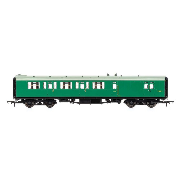 In 1938, with the assistance of his Technical Assistant, L. Lynes, Bulleid began design work for new steam-hauled stock for the Bournemouth and Weymouth services, placing the order for fifty-four 57' 11" underframes with Lancing Works. With the onset of the Second World War, the supply of bodies for these was put on hold and it was not until 1944 before the orders for the bodies could be placed, the first of these being finished at Eastleigh Works in November 1945. Featuring a smooth, continuously curved bodyside, with small fixed windows above the door windows, the exterior was distinctly Bulleid in character and was a perfect match for his streamlined Pacifics and Light Pacifics.