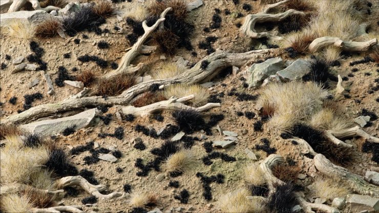 Very small and low tufts with black shades. Best used to simulate dark crustose lichens on rocks, bark, and shaded ground. In combination with other colours and textures, they provide realistic detail. At very small scales, they are perfect to recreate rugged, weathered surfaces.