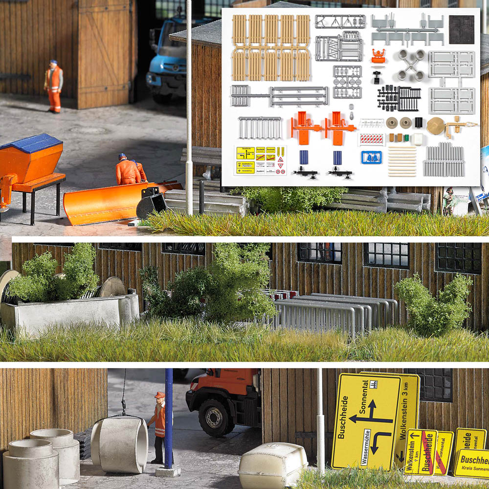 Kit contains an abundant amount of accessories to complement a maintenance depot, i.e. a snow plow, a road sweeper, containers for road salt, a sand pile, a wheelbarrow, tools, sacks, guard railings, concrete tunnel tubes, cable rolls, lamps, road safety barriers, stantions, oil and water tanks, manhole covers, road signs, etc.