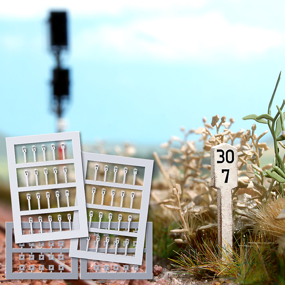 The 40 milestones, printed on both sides, are copied from originals primarily used on railroad lines. Originally the stones were spaced every kilometer. When spaced every 100 meters, they are known as hectometer stones. The contents of the package (from km 27,0 through 30.9) would cover 3.9 km of an original railroad.