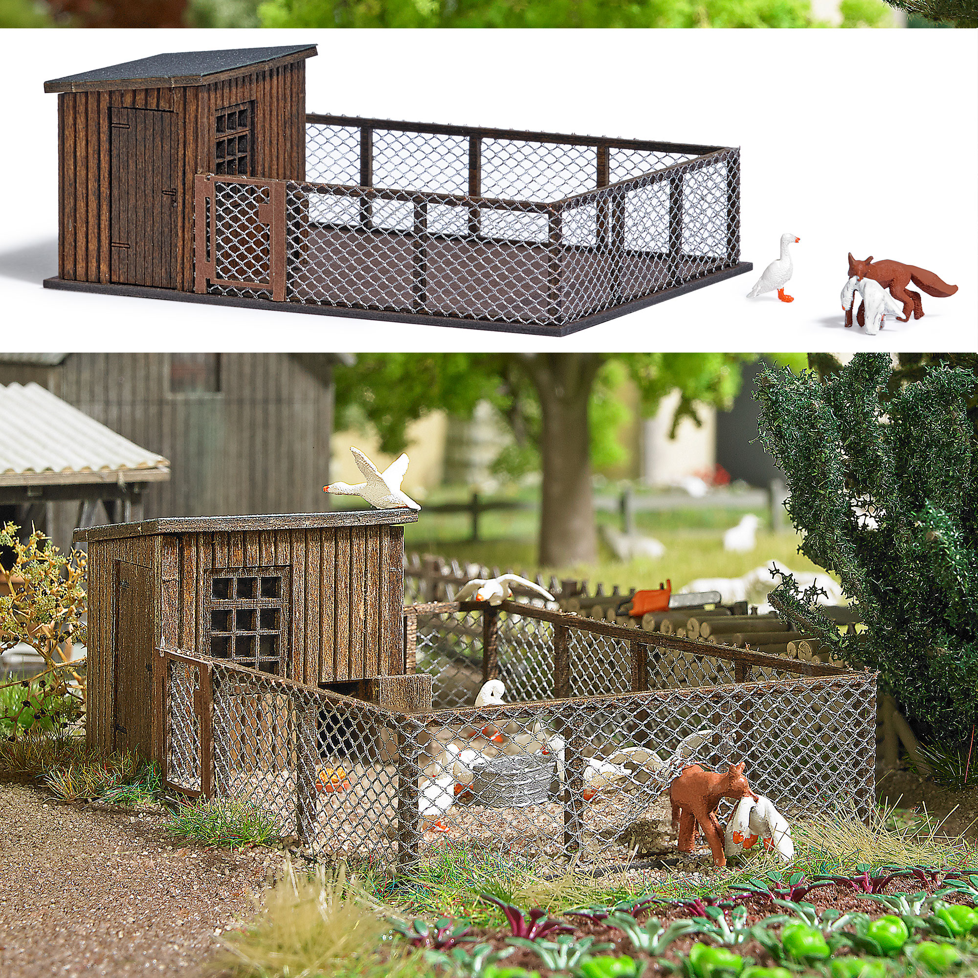 Includes a fox with a goose in its mouth, a goose, a genuine wooden hutch and a pen with a chicken wire fence, supported by genuine wooden stakes.